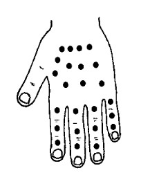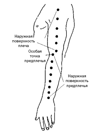 Восемь точек наружной стороны предплечья расположены на линии, соединяющей наружный конец локтевой складки с запястьем на уровне промежутка между средним и безымянным пальцами (рис. 44, в). Каждую точку надавливаем большим пальцем массирующей руки в течение 5 секунд.