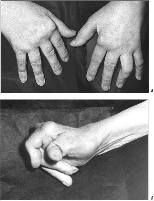а — выраженные экссудативно-пролиферативные изменения, ульнарная девиация кистей, подвывихи концевых фаланг пальцев правой кисти, подвывихи в пястно-фаланговых, проксимальных межфаланговых суставах IV и V пальцев левой кисти. Нарушение функции схвата и удержания предмета. Нарушение функции суставов 3-й степени. Инвалидность II группы; б — резко выраженные пролиферативные изменения со сгибательными и разгибательными контрактурами, атрофией мышц в суставах правой кисти. Невозможность схвата и удержания предмета, самообслуживания. Нарушение функции суставов 3-й степени. Инвалидность I группы