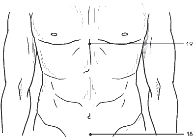 Точка 19. Точка, расположенная выше пупка, симметрично предыдущей точке. Выполнять быстрые нажимания следует по тому же принципу, что и для точки 18.
