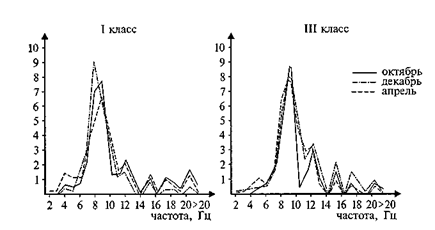 Рис. 82. Динамика частотного спектора ЭЭГ детей 7–8 лет (I класс) в течение учебного года. Отмечается стабилизация параметров альфа-ритма к 9-10-летнему возрасту (3-й класс)