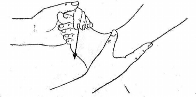 По внутренней головке — выполняется легкое растирание подушечками пальцев, пиление, широко используются расслабляющие приемы: вибрационное поглаживание, потряхивание, мягкое и сильное разминание, растяжение в сочетании с вибрацией.