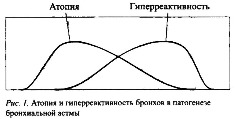 Острые респираторные заболевания очень часто ассоциированы с приступами бронхиальной астмы. У 40% астматиков выявляются антигены респираторно-синцитиального вируса, парагриппа и гриппа, риновируса и аденовируса. Предполагается, что вирусы снижают чувствительность Р-адреноре- цепторов, повреждают эпителий и таким образом повышают реактивность бронхов, а также способствуют переключению иммунного ответа на ТЬ2-вариант. До 50% детей, перенесших на 1-м году жизни бронхиолит, вызванный респираторно-син- цитиальным вирусом, заболевают бронхиальной астмой в течение последующих 8 лет. Таким образом, атопия и гиперреактивность бронхов тесно переплетаются в патогенезе бронхиальной астмы, взаимно стимулируя и поддерживая друг друга (рис. 1).