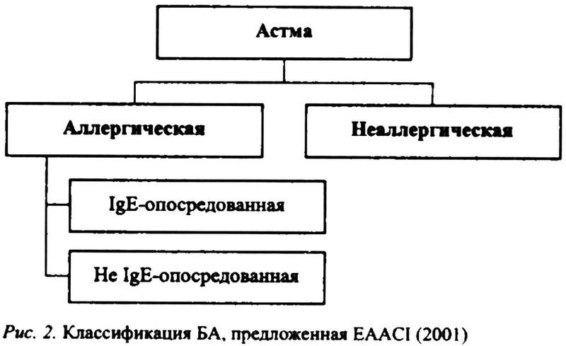 В связи с изменением аллергической номенклатуры эксперты EAACI (Европейская академия аллергологии и клинической иммунологии) предложили несколько изменить (в сторону упрощения) и классификацию БА, оставив только аллергическую (опосредованную иммунными механизмами) и неаллергическую астму, выделив в аллергической астме IgE- опосредованный и не IgE-опосредованный варианты (рис. 2).