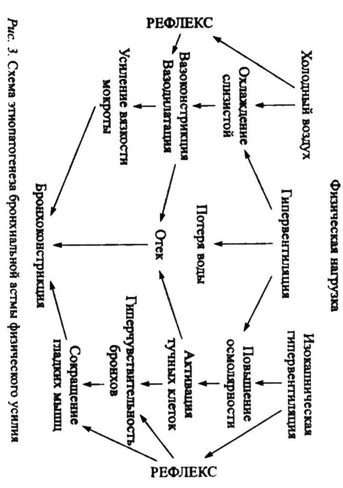 Бронхиальная астма физического усилия – это одно из проявлений гиперреактивности дыхательных путей, а не особая форма БА. В механизме бронхиальной обструкции основную роль, вероятно, играет охлаждение и «пересушивание» слизистой оболочки дыхательных путей (рис. 3).