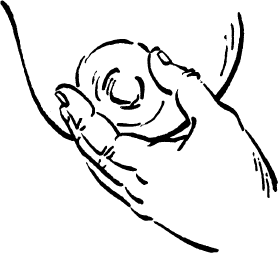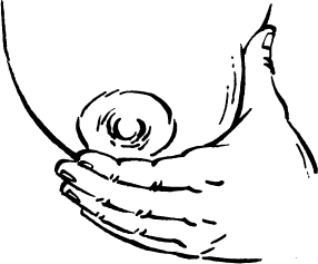 Рис. 140. Чтобы дать грудь ребенку, возьмите ее большим и указательным пальцами возле околососкового кружка и приблизьте сосок к губам ребенка