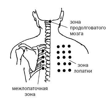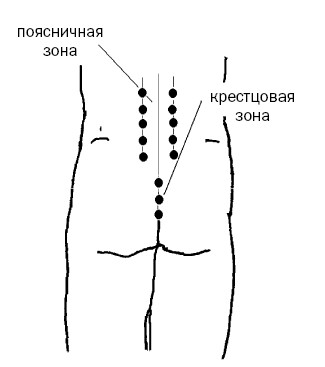 3. Простукиваем четырьмя пальцами точки поясничной и крестцовой области (рис. 10, б).