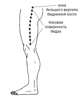 4. Шлепаем открытой ладонью зоны бедер (рис. 10, в). Используем точки, расположенные выше большого вертела бедренной кости. Эти точки являются основными для успокоения слизистой оболочки кишечника и прекращения поноса, выполним 5 надавливаний на каждую точку длительностью 3 секунды.