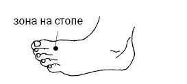 5. Указательным и средним пальцами сильно стучим по точке между основаниями 1-го и 2-го пальца ноги. Можно воздействовать одновременно на обеих стопах по 1 минуте (рис. 10, г).