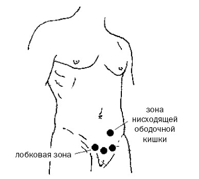 6. Ладонью медленно и плотно надавите (не ударяя) на низ живота (лобковую зону) и на зону над нисходящей ободочной кишкой (рис. 10, д).