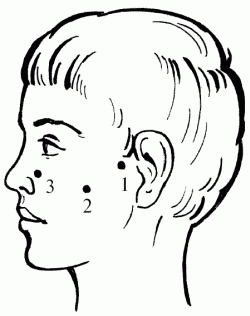 Описание: осуществляется массаж одновременно в точках ИН-СЯН, СЯ-ГУАНЬ, ЭР-МЭНЬ.