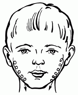 Описание: легкое поглаживание скуловых мышц от мочек ушей к середине подбородка.