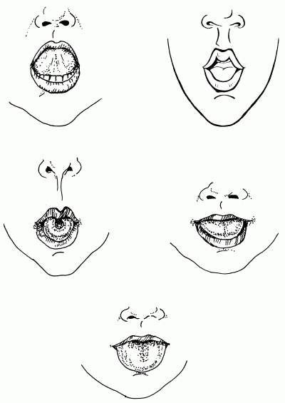 Цель: расслабление круговой мышцы рта, мышц, поднимающих верхнюю губу и углы рта кверху, опускающих нижнюю губу и углы рта вниз.