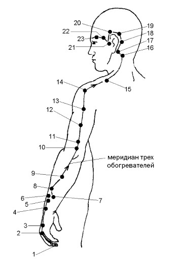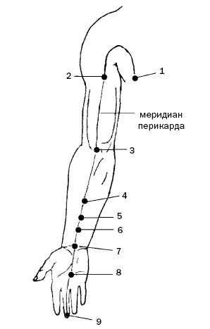 Главные точки меридиана: возбуждающая точка – 9 Чжун-чун, успокаивающая точка – 7 Да-лин, противоболевые точки – 4 Си-мэнь.