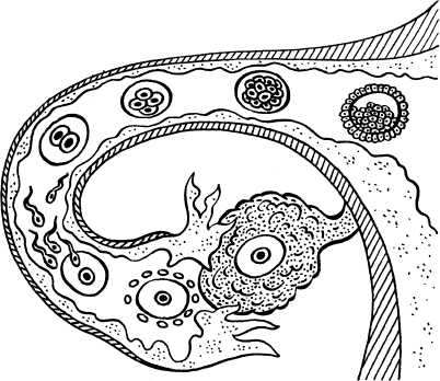 В момент овуляции яйцеклетка, выйдя из яичника и попав в маточные (фаллопиевые) трубы, совершает по ним путешествие благодаря течению жидкости, ритмичным сокращениям и движениям маленьких выростов в трубах (рис. 4). Туда же, в маточные трубы после полового акта попадают сперматозоиды, где и происходит слияние яйцеклетки с самым сильным и энергичным сперматозоидом. А пока сперматозоиды хаотично двигаются во всех направлениях, большинство из них, подвергаясь воздействию кислой среды вагинальных секретов, погибают в течение нескольких часов, не достигая канала шейки матки. Очень небольшой процент от общего числа сперматозоидов в действительности добирается до полости матки и предпринимает путешествие вверх.