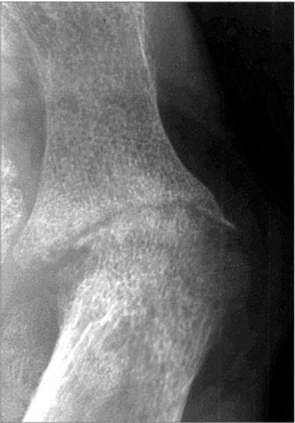 Прямое 7-кратное увеличение рентгеновского изображения. Резко выраженный диффузный остеопороз. Значительное неравномерное сужение суставной щели с истончением, разрушением замыкающей костной пластинки. Множественные глубокие краевые дефекты костной ткани с размытыми краями (эрозии), расположенные субпериостально, в зоне сустава