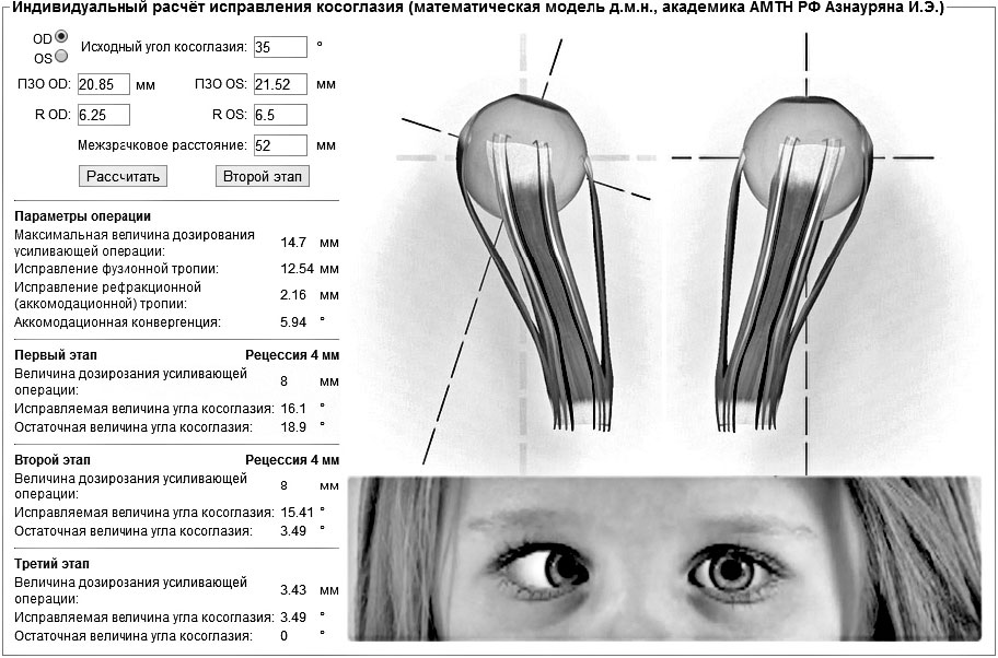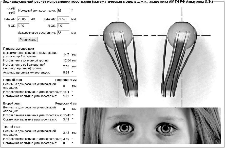 Технология носит название «СТРАБО» (система математического моделирования) и позволяет рассчитать точность операции до десятой доли миллиметра с учетом индивидуальной анатомии глаз вашего ребенка (длину передней оси глаза, расстояние между зрачками, угол косоглазия, величину дальнозоркости). Например, высчитывается величина поворота глазного яблока, чтобы была достигнута симметрия зрительных осей.