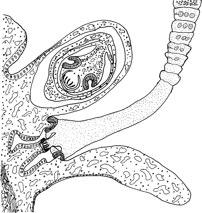 Рис. 19. Карликовый цепень и его личинка в кишечнике