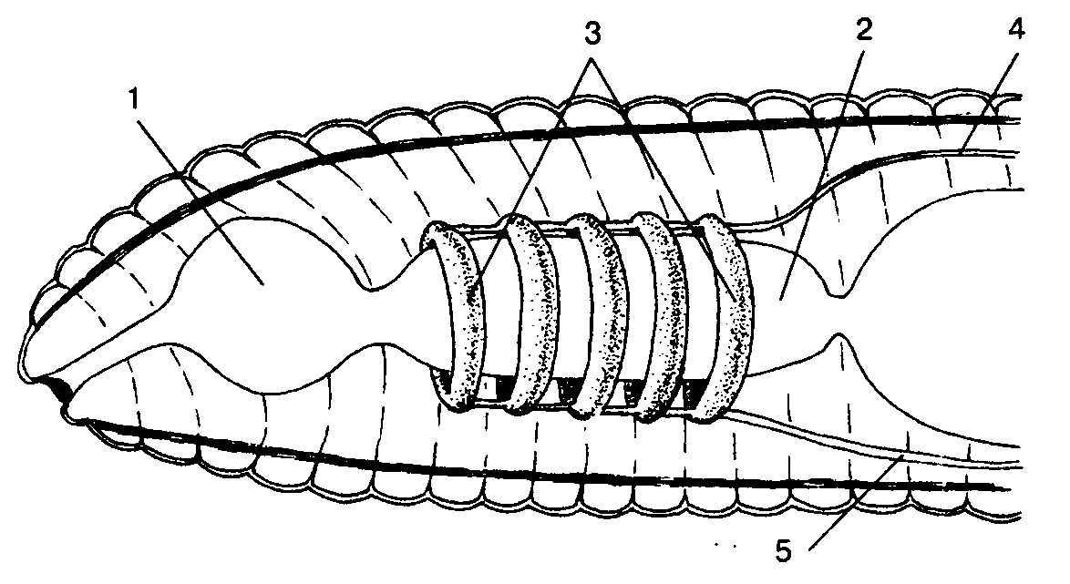 Кольцевые «сердца» дождевого червя: 1 – глотка; 2 – пищевод; 3 – сердца; 4 – спинной кровеносный сосуд; 5 – брюшной 'кровеносный сосуд