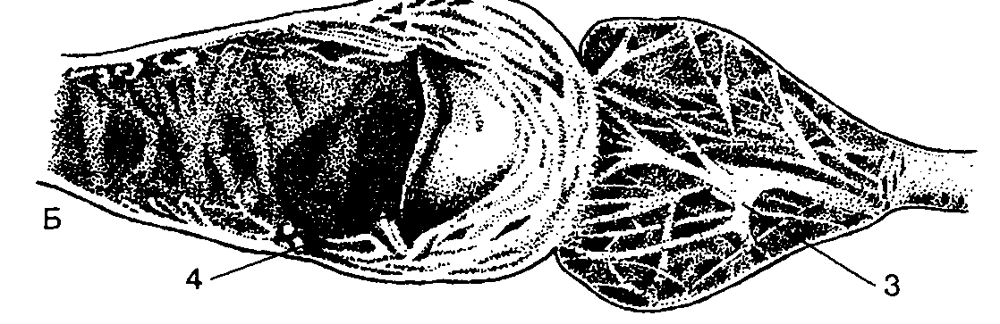 Строение сердца моллюсков: I – морского блюдечка; II – виноградной улитки; А – внешний вид; Б – вскрытое сердце; 1 – предсердие; 2 – желудочек; 3 – тяжи соединительной ткани; 4 – клапан