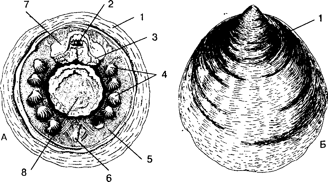 Моноплакофора неопилина Галатеи:А – вид снизу; Б – вид сверху; 1 – раковина; 2 – ротовое отверстие; 3 – щупальца; 4 – жабры; 5 – край мантии; 6 – анальное отверстие; 7 – голова; 8 – нога