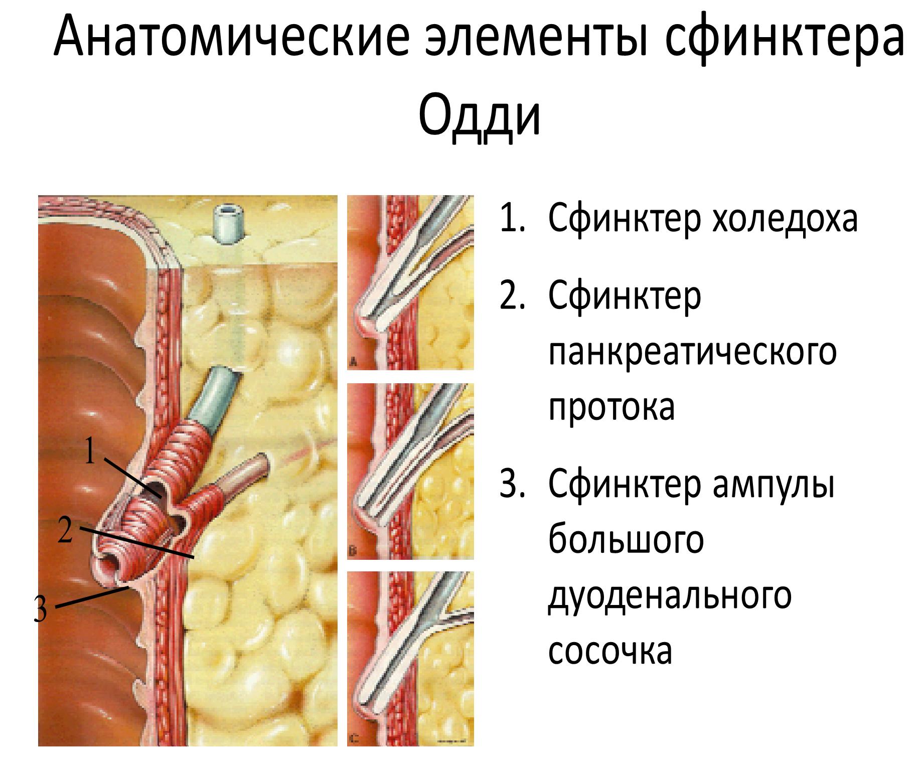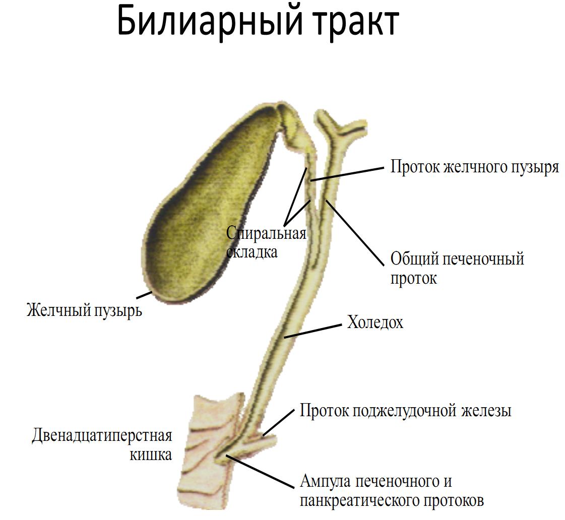 При изложении данного раздела напомним самые основные данные об анатомии и физиологии желчеотделения. Билиарный тракт включает в себя общий печеночный проток, образующийся от слияния правого и левого печеночных протоков, желчный пузырь (ЖП) со сфинктером Люткенса, общий желчный проток, начинающийся от места соединения печеночного и пузырного протоков и билиарно-панкреатическую ампулу со сфинктером Одди (СО). Последний состоит из сфинктера общего желчного протока, сфинктера панкреатического протока и общего сфинктера ампулы (сфинктер Вестфаля).