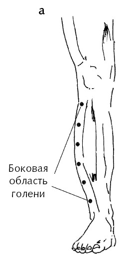 1. Вытягиваем ноги и сильно надавливаем большим пальцем на точки голени. При взаимомассаже можно обхватить ногу четырьмя пальцами обеих рук с внутренней поверхности голени (для удерживания) и надавливать большими пальцами на всю боковую поверхность голени (рис. 19, а).