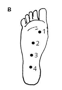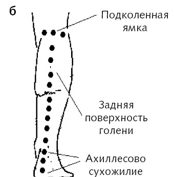 3. Затем надавливаем по 3 секунды на все приведенные точки задней поверхности голени и лодыжки и подошвы стоп (рис. 19, б, в).
