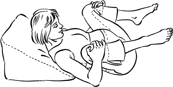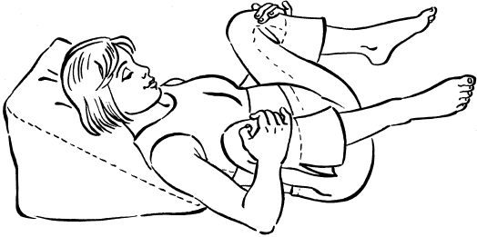 Рис. 128. В положении лежа на спине во время потуг широко разведите колени, обхватите их руками и подтяните к груди