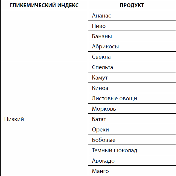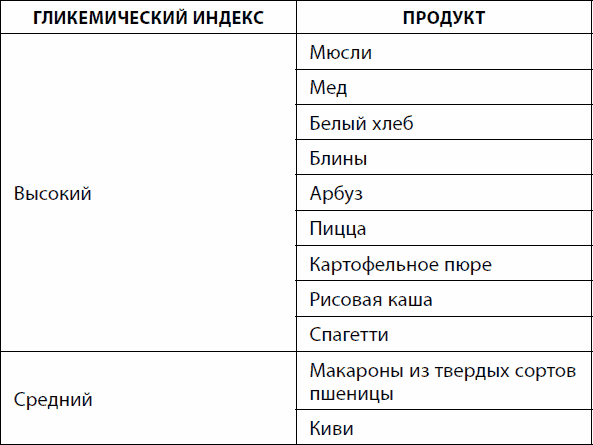 Таблица 33. Примеры продуктов с разным гликемическим индексом