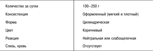 Консистенция и форма. Различают плотный, или оформленный, густо– или жидкокашицеобразный и водянистый кал. Растительный рацион, как правило, дает густокашицеобразный кал, пища животного происхождения – кал цилиндрической формы. Стенозы или спазмы толстой кишки приводят к образованию так называемого «карандаша», или «овечьего кала». Жидкокашицеобразный или водянистый кал сигнализирует об избытке жидкости в испражнениях (больше 80 %) и является признаком ускоренной перистальтики или гиперсекреции в толстой кишке.