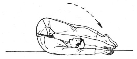 Сделайте вдох, одновременно медленно отрывая прямые ноги от пола и поднимая их над головой. Удерживая ноги наверху, опускайте спину на пол. Затем медленно опустите прямые ноги. Момент касания пятками пола должен прийтись на окончание выдоха. Сразу же расслабьтесь и примите И. п.