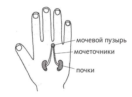При хронических заболеваниях почек и мочевого пузыря воздействуем на область почек и мочеточников. На ладонях области подобия обеих почек располагаются в промежутках между пястными костями ближе к запястью. На стопах — между костями плюсны, ближе к предплюсне (см. рис. 28, а, б). При надавливании соответствующие зоны на стопах и ладонях прощупываются как небольшие углубления.