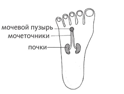 Для стимуляции работы почек в корейской, китайской, японской медицине существует еще одна важная зона. Ее сравнивают с «бурлящим источником». Она, к слову, и является истоком большого меридиана почек, проходящего через все тело. Точка расположена в середине подошвы, между 2-й и 3-й плюсневыми костями, в углублении, образующемся при поджатии пальцев стопы (в середине подошвы, см. рис. 28, г). Эту зону часто используют в критических состояниях организма, при ломоте в суставах, головной боли, при сердцебиении и при кардионеврозах. О том, что такое точки-истоки, мы будем говорить в главе 8 «Лечебные атласы зон соответствия различным органам и частям тела на ладонях и стопах».