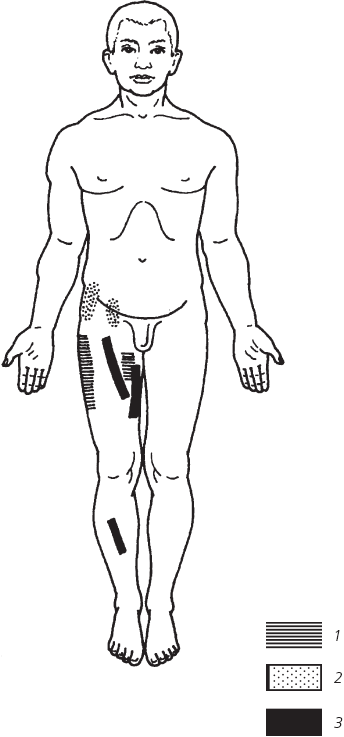 1 – на коже; 2 – в соединительной ткани; 3 – в мышечной ткани