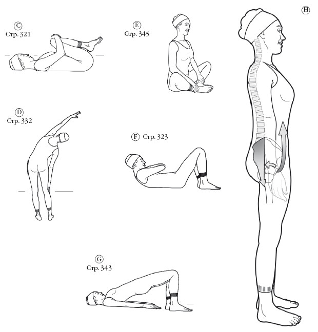 В связи с взаимосвязью поясничного отдела и тазового пояса (смотри с. 68, 255) рекомендуется выполнять следующие упражнения для коррекции мышечного дисбаланса, возникшего вследствие сидячего образа жизни (формирующего гиперлордоз).