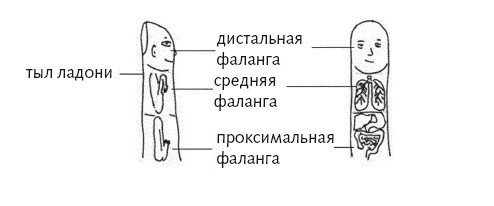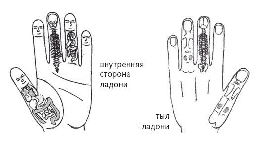 Итак, система насекомого усматривает, что на каждом пальце руки или стопы имеется трехуровневое соответствие человеческому телу. Первая фаланга пальца руки, наиболее отдаленная от центра тела, в медицине называется дистальной. Дистальной фаланге всегда соответствует голова. На ближнюю (проксимальную) фалангу проецируется брюшная область. И средняя фаланга, таким образом, соответствует грудной клетке. Какой бы уровень строения нас ни заинтересовал (поверхность тела, мышечный корсет, внутренние органы, скелет), он проецируется на палец в том же порядке. Черепная коробка и шея?— на дистальную фалангу, грудной отдел позвоночника — на среднюю, поясничный отдел и крестец?— на проксимальную фалангу. Это не трудно представить, если мы рассмотрим соответствующие рисунки 6 (а, б, в, г).