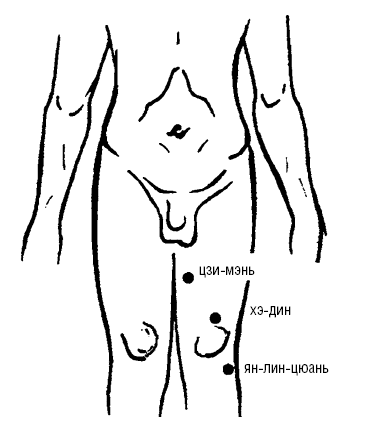 1. ЦЗИ-МЭНЬ (КР-11) находится на внутренней поверхности бедра, на уровне точки ФУ-ТУ (бедренная), и расположена на 6 цуней выше верхнего края надколенника.