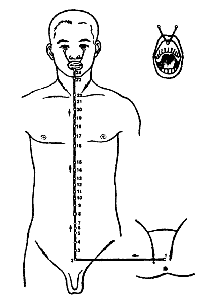 1 – хуэй-инь; 2 – цюй-гу; 3 – чжун-цзи; 4 – гуань-юань; 5 – ши-мэнь; 6 – ци-хай; 7 – инь-цзяо; 8 – шэнь-цюе; 9 – шуй-фэнь; 10– ся-вань; 11 – цзянь-ли; 12 – чжун-вань; 13– шан-вань; 14– цзюй-цюе; 15– цзю-вэй; 16– чжун-тин; 17 – тань-чжун; 18 – юй-тан; 19 – цзы-гун; 20 – хуа-гай; 21 – сюань-цзи; 22 – тянь-ту; 23 – лянь-цюань; 24 – чэн-цзянь