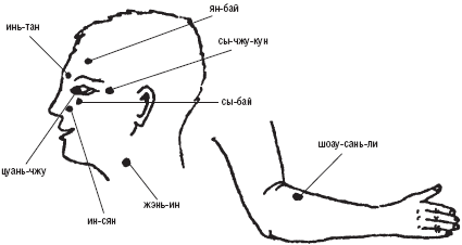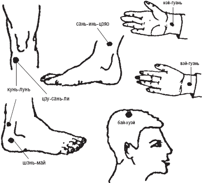 Рис. 44. Методика точечного массажа при «взвинченном» состоянии, бессоннице, апатии, чувстве дискомфорта