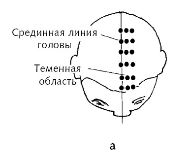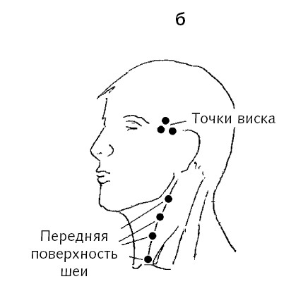 1. Надавливаем на макушку по приведенным точкам (рис. 73, а) совмещенными указательным и средним пальцами (в течение 3 секунд на каждую точку). Голова после надавливания должна «проясниться».