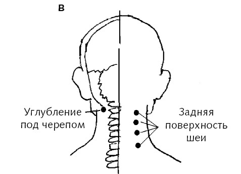 в). Затем еще раз надавите на точки затылка (рис. 73, а) большими пальцами.