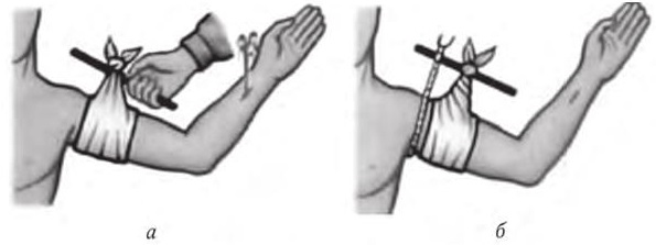 а, б – этапы наложения жгута