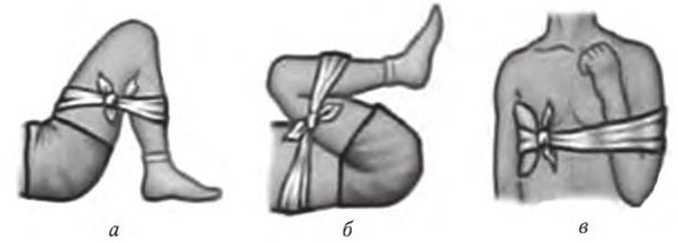 а – ватно-марлевый валик в сгиб коленного сустава; б – ватно-марлевый валик в сгиб бедренного сустава; в – ватно-марлевый валик в подмышечную впадину