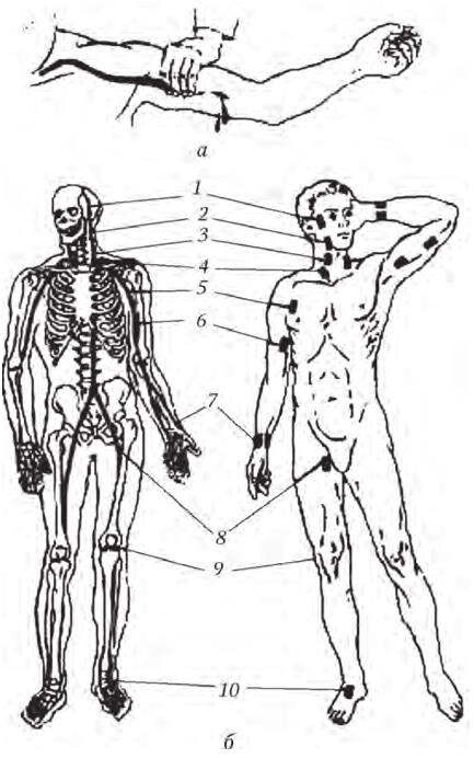 а – методика прижатия артерии; б – типичные места прижатия артерий: 1 – височной; 2 – нижнечелюстной; 3 – общей сонной; 4 – подключичной; 5 – подмышечной; 6 – плечевой; 7– лучевой; 8 – бедренной; 9 – подколенной; 10 – тыльной артерии стопы