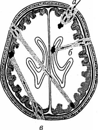 Слепые ранения черепа имеют одно входное отверстие и раневой канал различной протяженности, в конце которого залегает пуля или осколок. Слепые ранения можно разделить на простые, радиальные и диаметральные. Тяжесть слепого ранения определяется глубиной прохождения раневого канала и его размерами. К числу наиболее тяжелых относятся слепые ранения, проходящие по основанию мозга (рис. 16).