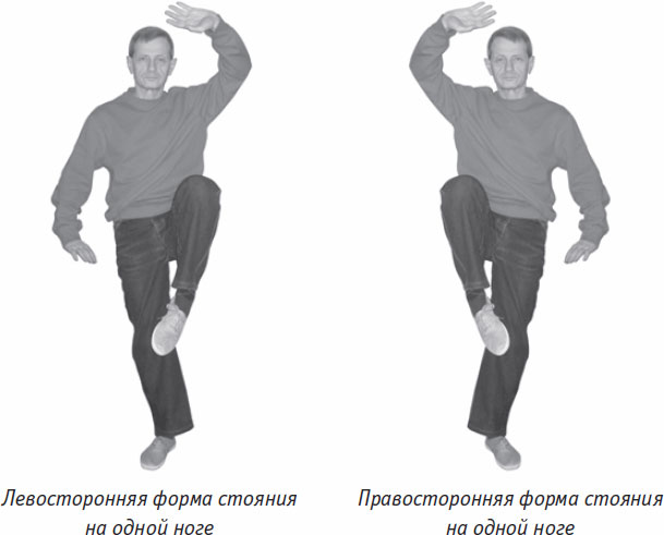Поднять левую ногу. Левую руку поместить над головой, центр ладони развернут вверх, ладонь словно поддерживает что-то снизу, пальцы направлены вправо. Правая рука опущена вниз, как бы нажимая на что-то сверху. Центр ладони обращен вниз, пальцы направлены вперед и чуть влево.