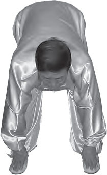 4. Провести руками по позвоночнику, затем по бедрам, наклоняя при этом туловище вперед. Руки опускаются вниз, проходят по задней части бедер и останавливаются на подъеме стоп. Голова поднята, взгляд направлен прямо и вниз. Нужно зафиксировать это положение (рис. 6–3).