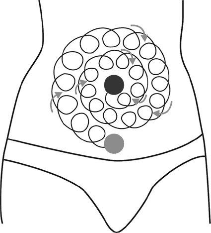 Максимально выдохните, втяните живот и медленно и плавно начинайте делать по нему круговые спиральные движения по часовой стрелке. Представьте, что внутри вашей ладони лежит шарик, который вы вкручиваете, вворачиваете вовнутрь на выдохе в живот (рис. 88). После того как вы вкатали все в точку, переходите по часовой стрелке на следующую спираль. Шаг между ними примерно 5 см.