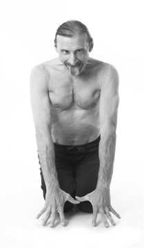2. Очень размеренно наклонитесь вперед, одновременно растопыривая пальцы рук в стороны и высовывая язык так, будто хотите достать им до подбородка.