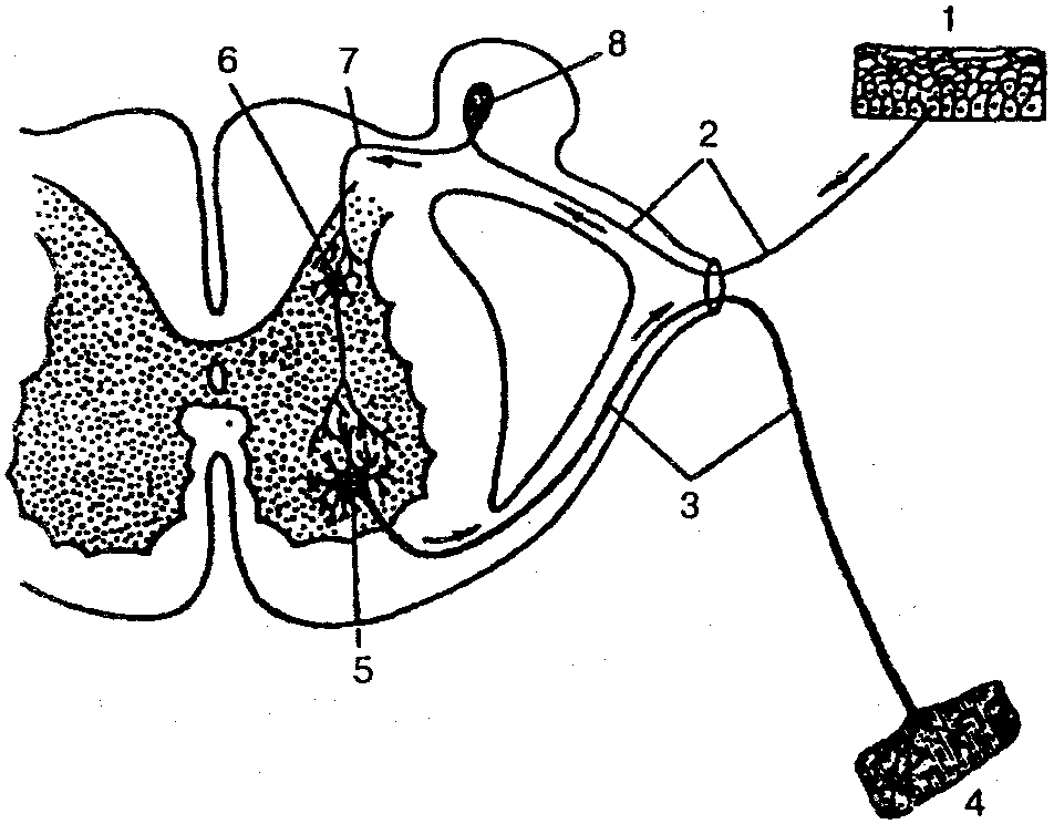1 — нервные окончания чувствительного нейрона в коже; 2— периферический отросток чувствительного нейрона; 3 — нейрит двигательной клетки; 4 — нервное окончание в мышце; 5 — двигательная клетка переднего рога; 6— вставочный нейрон; 7— центральный отросток чувствительного нейрона; 8— спинномозговой узел